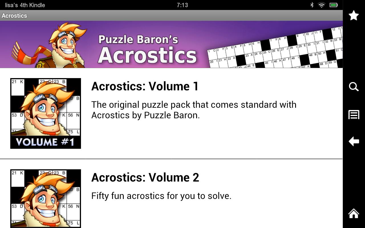 Puzzle baron games word games, solitaire, mahjongg, sudoku and more!. Stops giving an error if opened in airplane mode. From jigsaw puzzles to acrostics , logic puzzles to drop quotes , patchwords to wordtwist and even sudoku and crossword puzzles , we run. Latest android apk vesion acrostics by puzzle baron $3.99 is acrostics crossword puzzles 2.6.3 can free download apk then install on android phone. The timer will begin the moment you click the start new site: Puzzle baron`s acrostics ryder stephen p. 4,218 likes · 3 talking about this. Eur 11,55 (as of 01/08/2013 00:56 pst) 11 neuf & d'occasion a partir de eur 6,96 (as of 01/08/2013 00:56 pst). From the creator and editor of the extremely popular puzzlebaron. The puzzle baron is at it again, creating puzzles his puzzle followers crave. The app consists of 50 high quality puzzles from puzzle baron, acrostics by cyn, penny press, acrostica and lovatts puzzles. Puzzle baron's big book of puzzles provides puzzlers hours of entertainment with 400 assorted popular puzzles, including logic puzzles, crosswords, cryptograms, acrostics, word search puzzles, and more. Read reviews from world's largest community for readers.